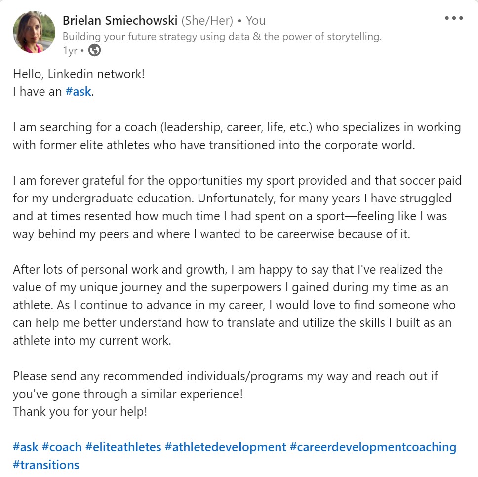 A year ago, I asked my network for recommendations on coaches specializing in elite athletes and transitions.